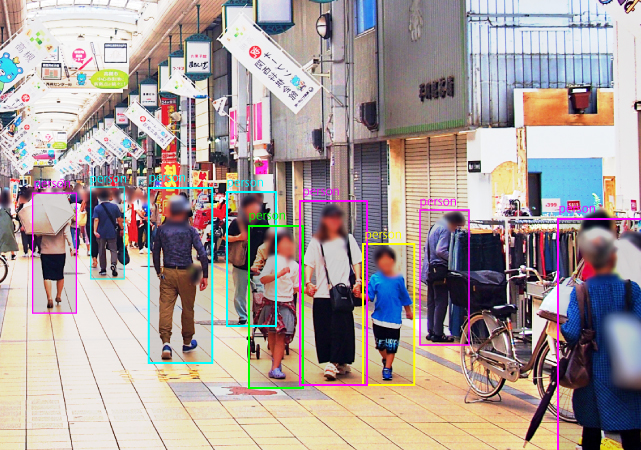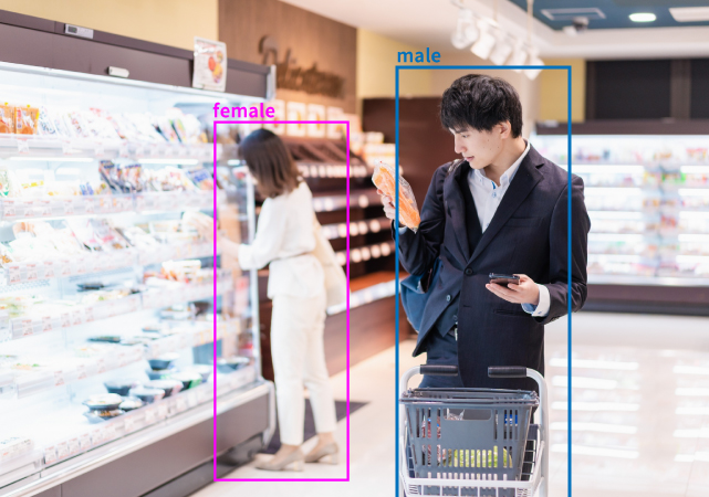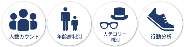 監視映像から被写体の行動分析やカテゴリー分析を行います。例えば、映った人物の年齢層や性別を判別したり、映った人数のカウントが可能です。セキュリティだけではなく、店舗や商業施設の集客状況分析の活用にも最適です。