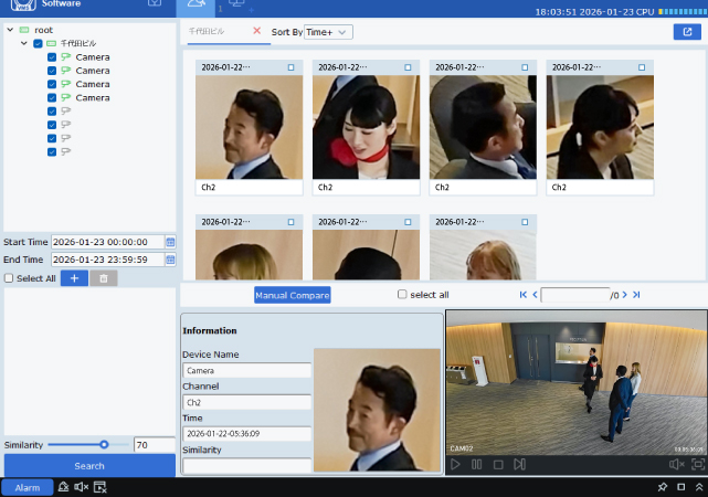 顔認証機能による検出・照合・通知が可能なため、予め対象者の顔画像を登録することで、映像から登録した人物の顔画像を自動で検出。映像確認の手間を省いたり、怪しい人物をブラックリストに登録したり、顔認証を活用した入退室管理などの活用ができます。