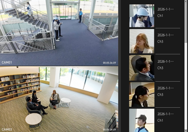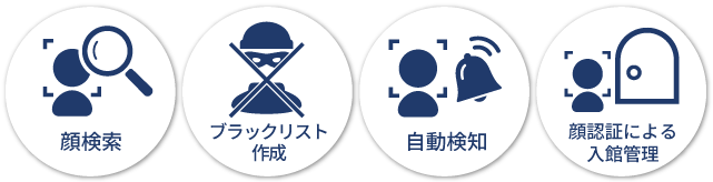 顔検出・照合・通知が可能なため、予め対象者の顔画像を登録することで、映像から登録した人物の顔画像を自動で検出。映像確認の手間を省いたり、怪しい人物をブラックリストに登録したり、顔認証を活用した入退室管理などの活用ができます。