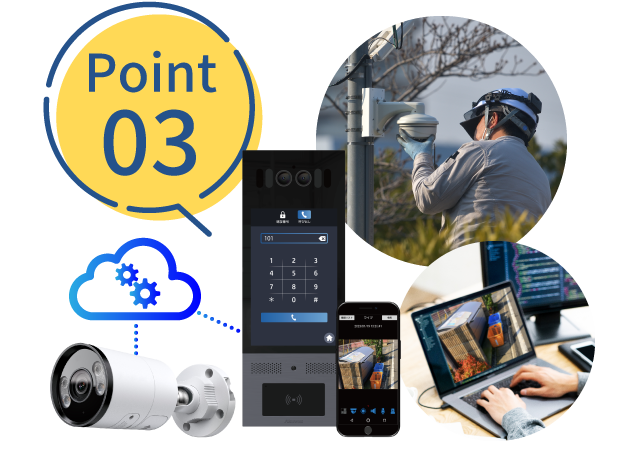 顔認証により入館の管理を行ったり、現場の状況確認ができます。音声出力・入力も可能なので、カメラを通じて現場スタッフと連絡を取り合うことも可能です。