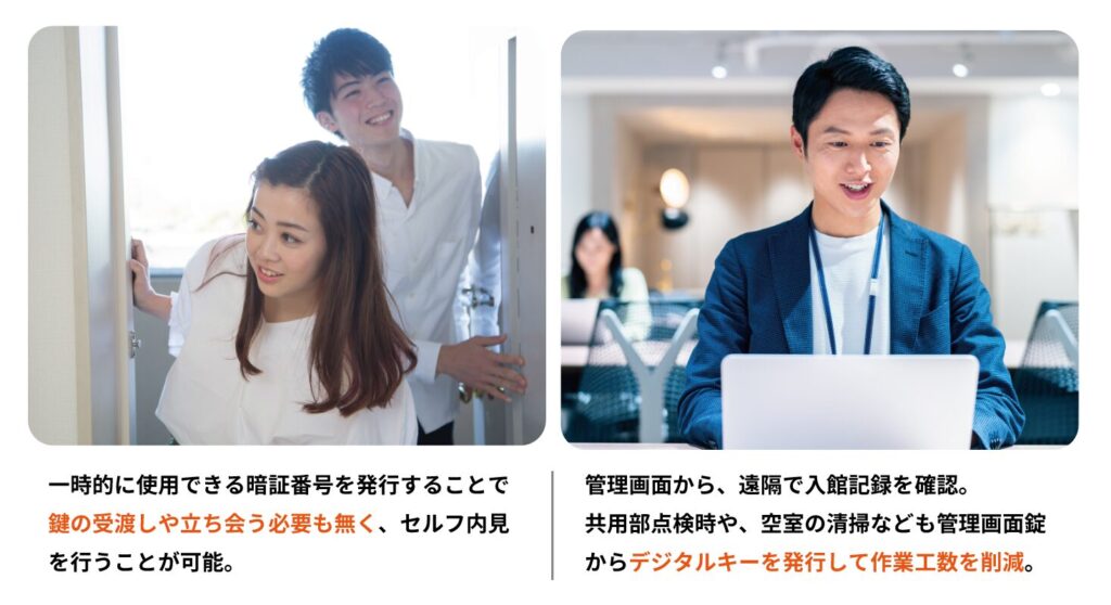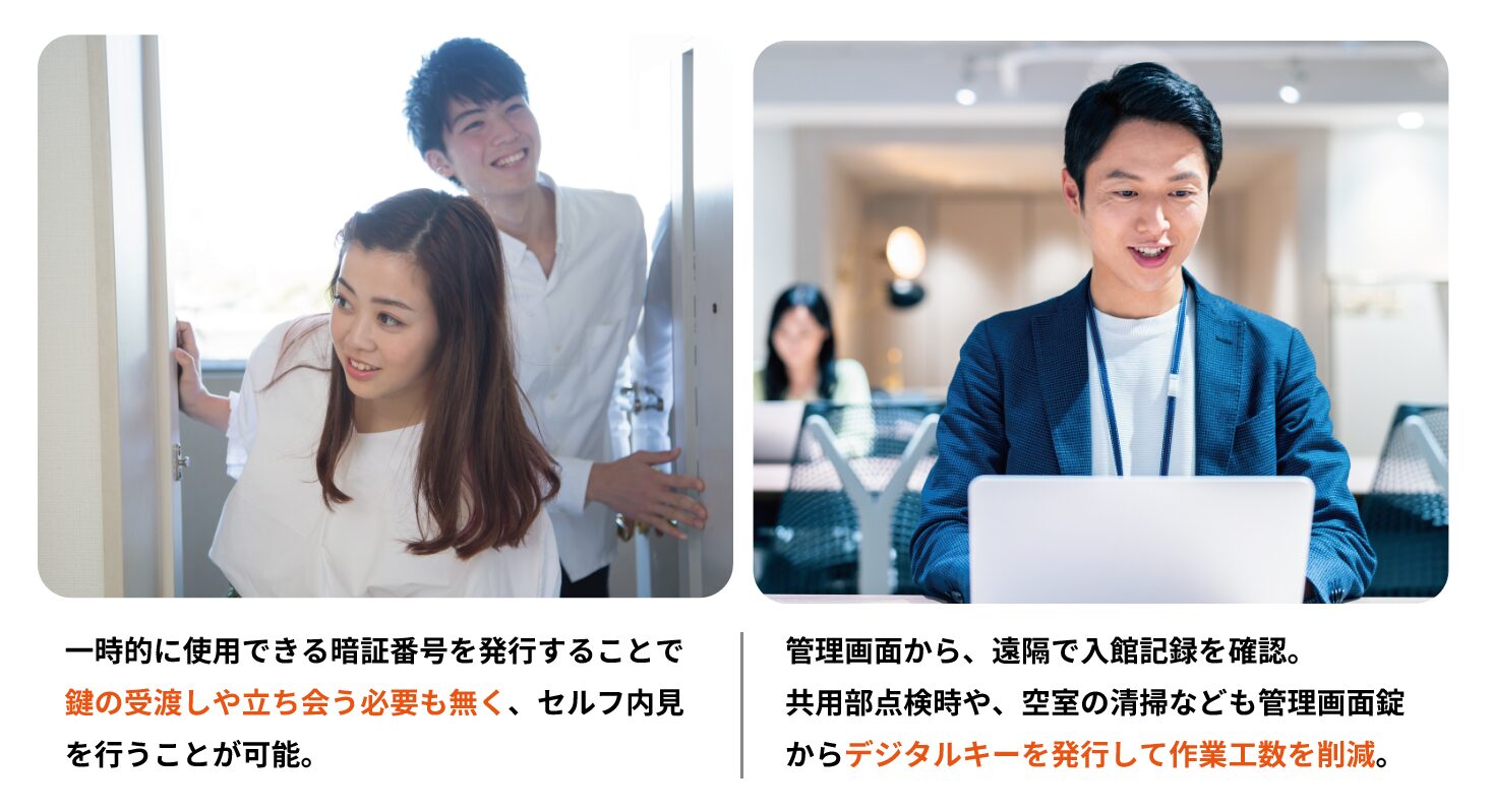 暗証番号やQRコードといったデジタルキーを発行できるため、鍵の受け渡しもメールの送付のみで完結します。